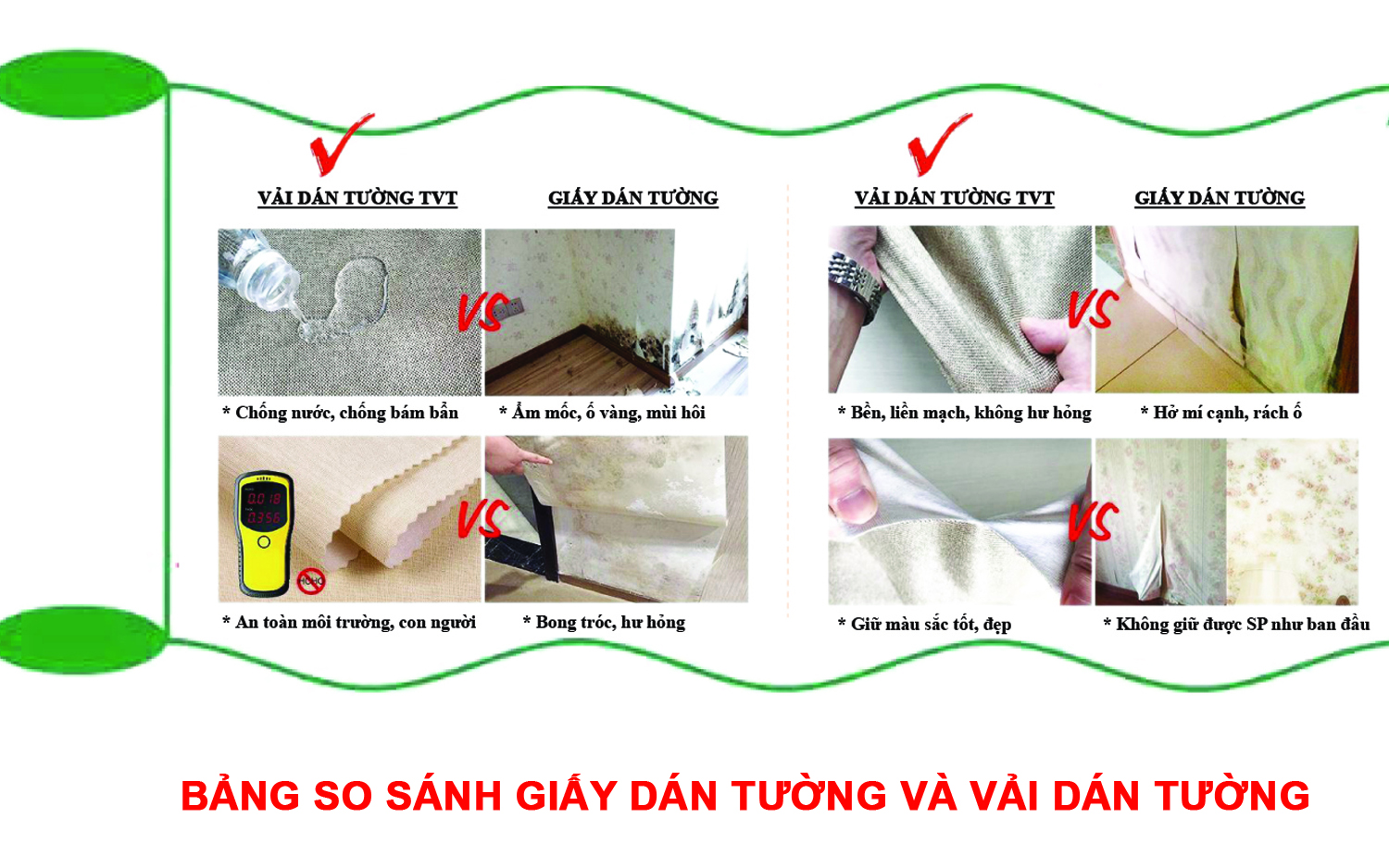 | Nếu tường ẩm mốc, hư hỏng xảy ra thế nào | Nếu tường ẩm mốc, Giấy dán tường bị ướt, bong tróc, nhả keo gây mùi ẩm ướt khó chịu và lộ mí cạnh mất thẩm mỹ | Vải dán tường bị nhả keo. Hiện trạng độ bền Vải dán tường vẫn giữ nguyên, không hư hỏng, không biến dạng. |